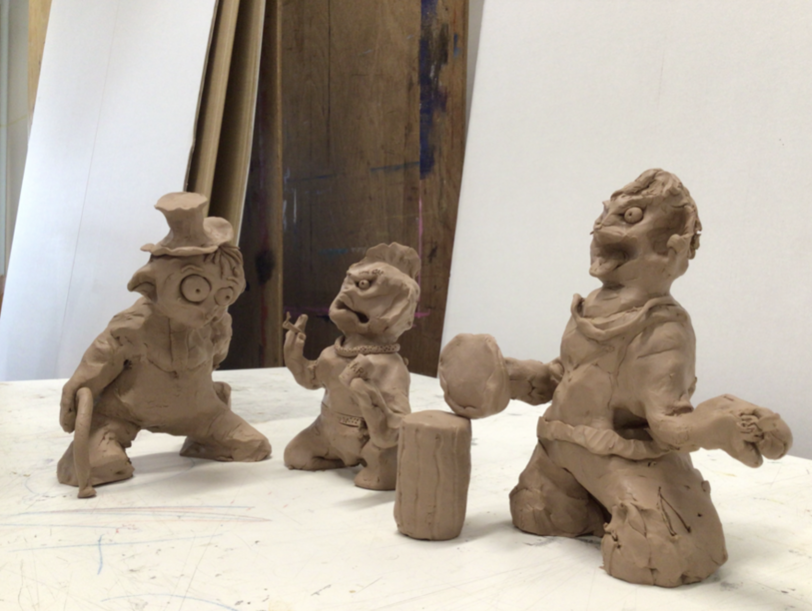 We all sit around a large table and have our ball of clay in front of us. Each of us adds a nose, ears, arms, a couple of legs, a funky hairstyle, and finally, a bunch of details. But after every addition, we move one seat to the right. This way, we end up with a bunch of quirky figures, each one touched-up by every student!