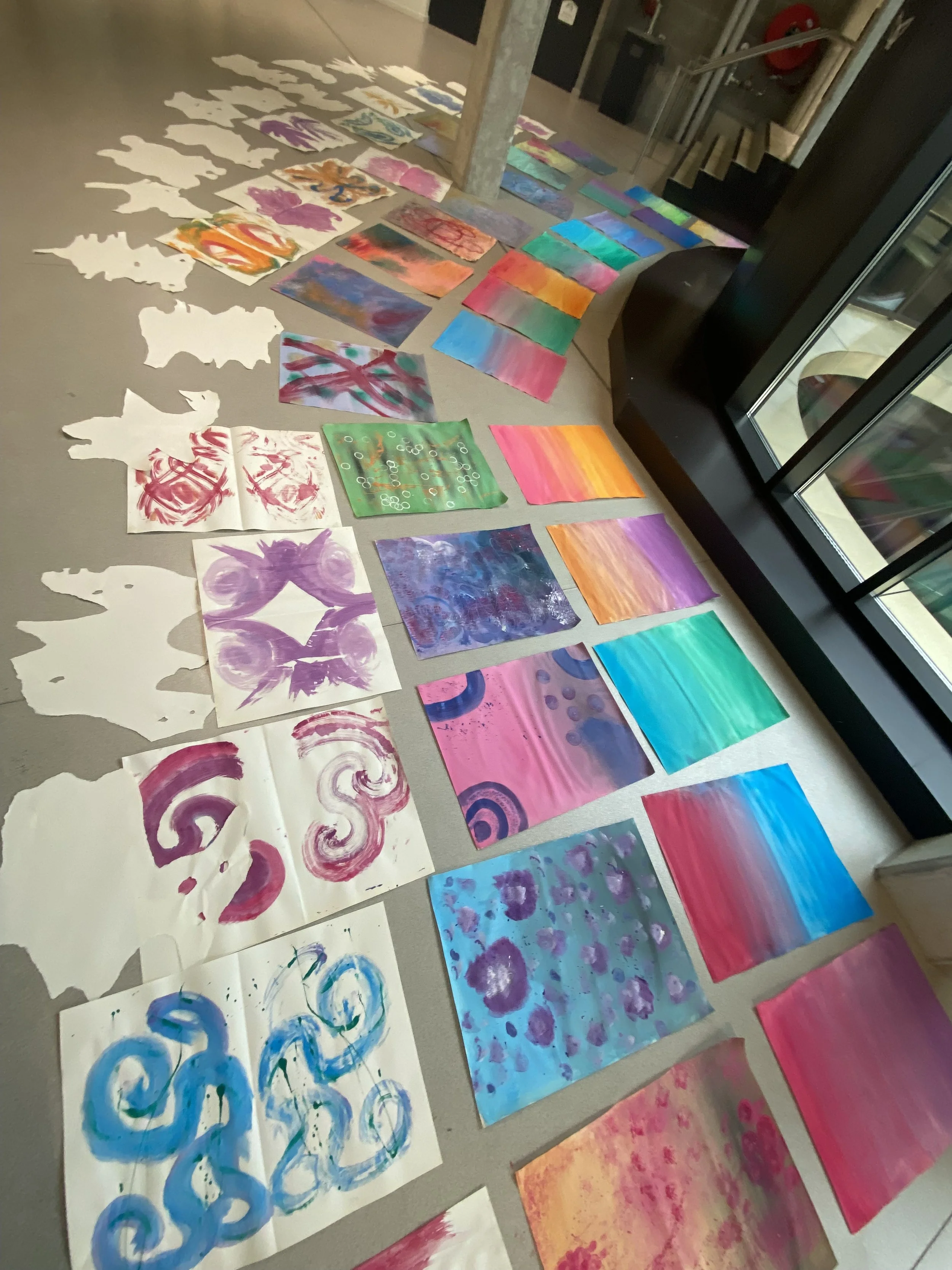 For the third experiment, we were given the creative freedom to paint whatever we wanted, as long as the entire sheet was covered! While the students worked, Pieter also enthusiastically finished his example and began cleaning up the main working-area. We placed the three completed drawings in the hallway to dry, quickly cleaned up the paint and brushes we used, and began the fourth and final experiment.