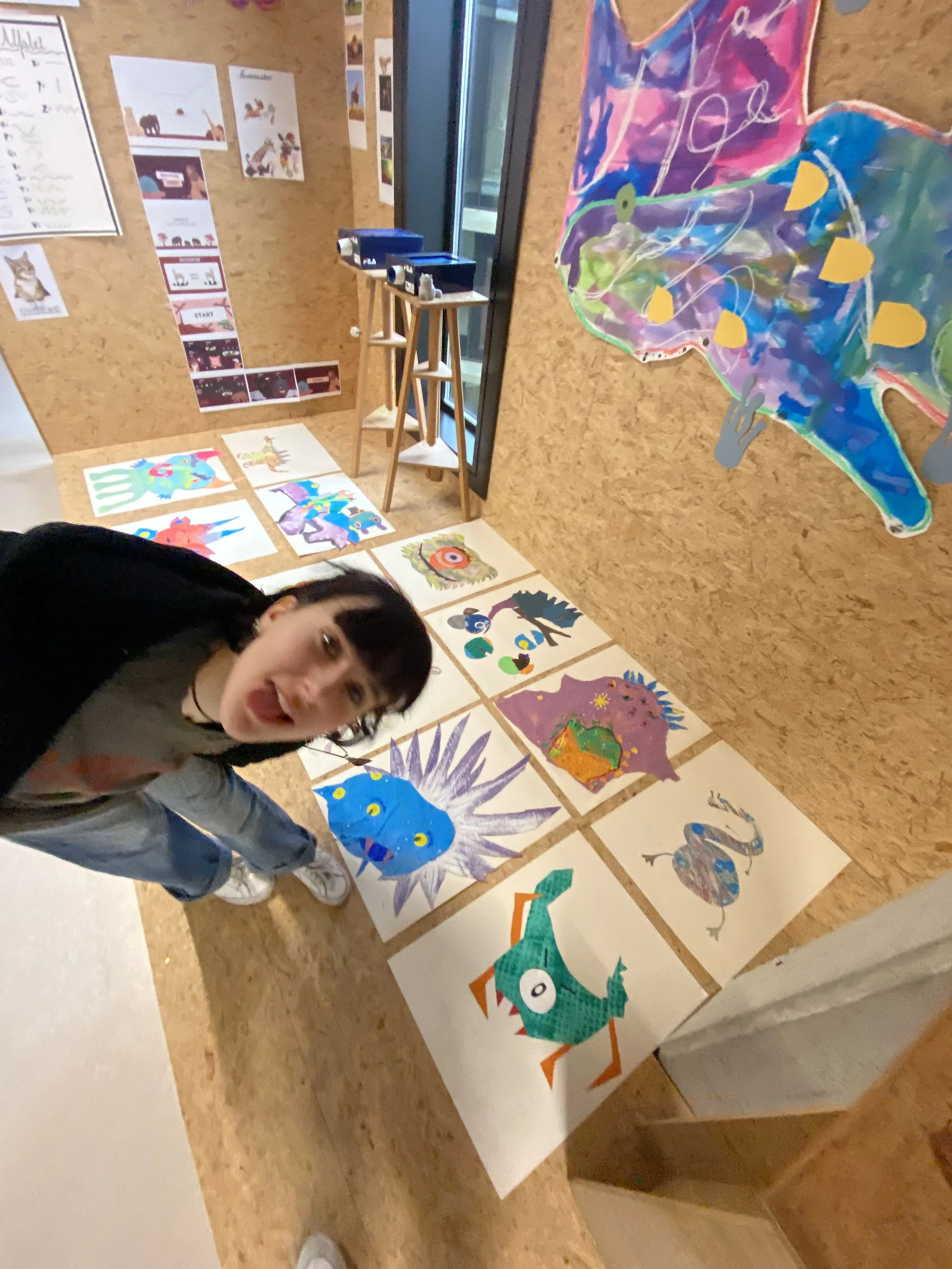 While our four strange drawings were drying in the hallway, we began the main task: creating a strange creature using various colored papers. We used artwork from former students and regular colored paper to create a collage representing our own fantasy monster. For this, the students used scissors, a cutting knife, a cutting mat, glue sticks, and felt pens. Afterward, we hung the results in the hallway across from the classroom.