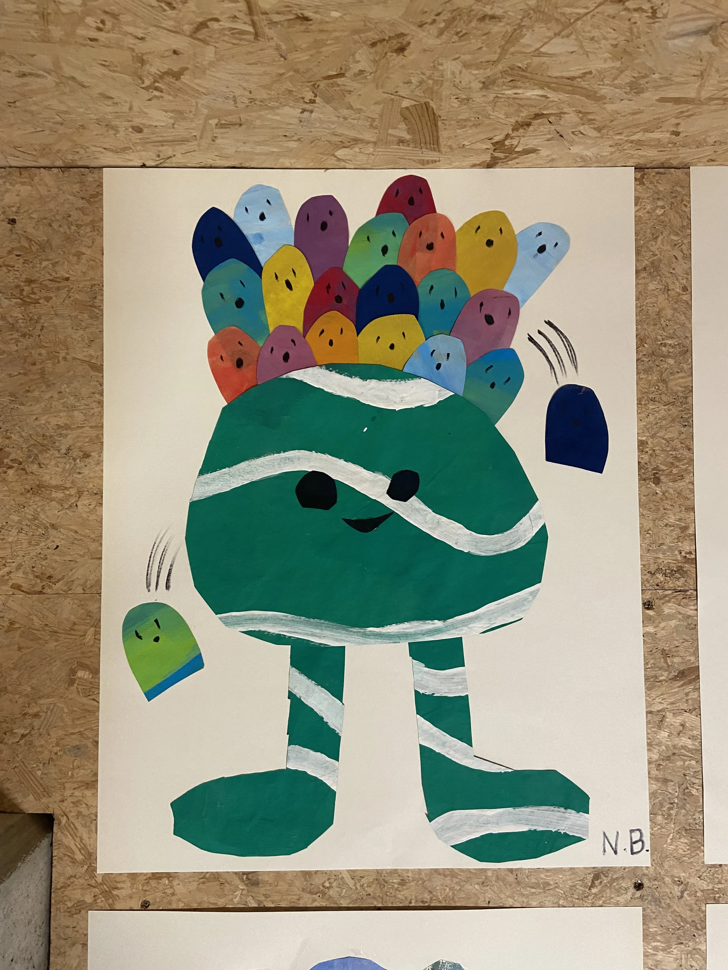 We were given another blank A3 sheet, but this time, we were asked to tear the paper instead of painting it. By tearing various corners, edges, and shapes in the large sheet and then making holes in it without causing the paper to rip into a thousand separate pieces, we created yet another strange creature. We placed this one with the other drawings.